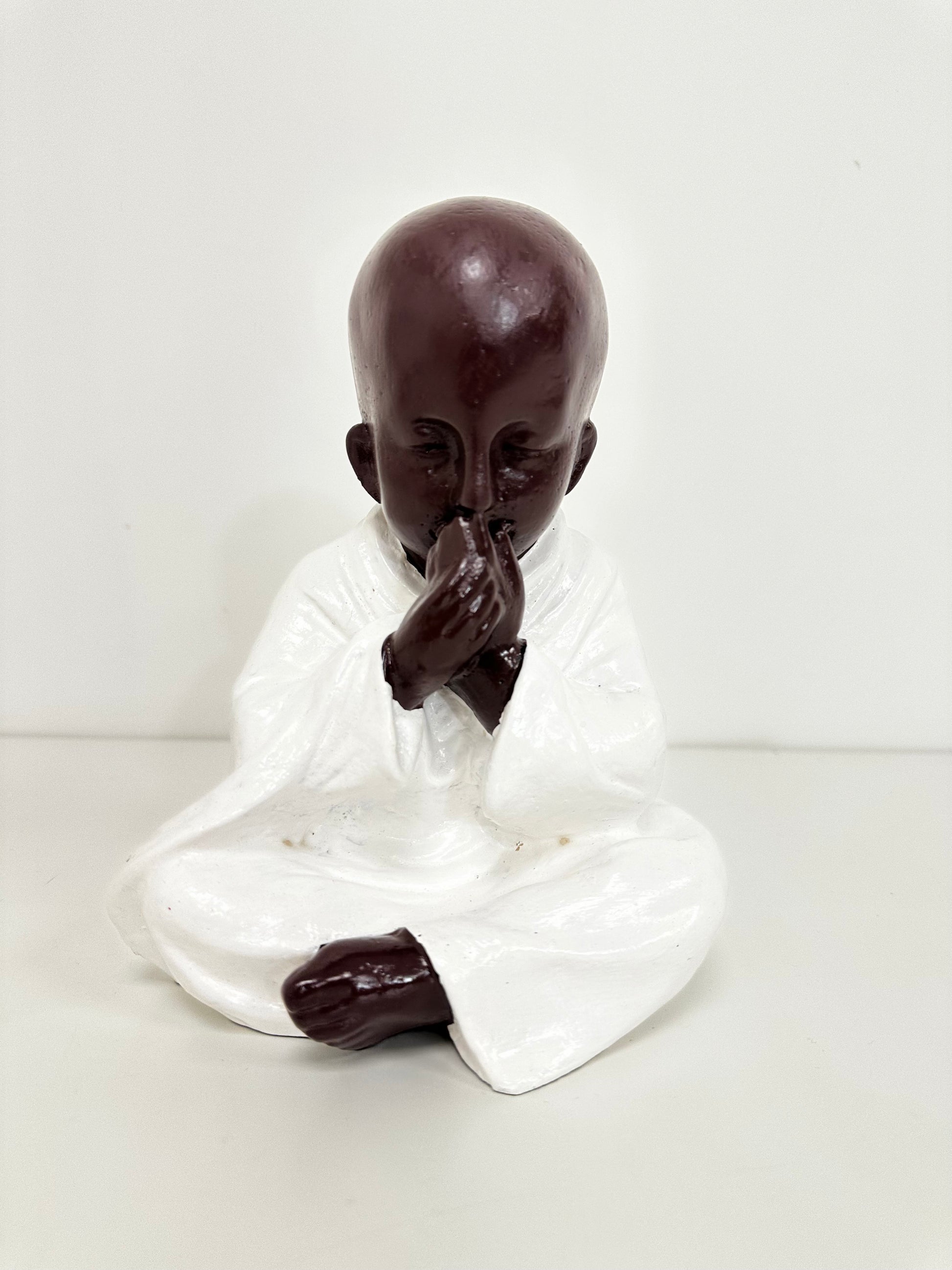 Statue décorative représentant un jeune moine assis, les mains jointes devant la bouche. Cette posture illustre le principe de ne pas dire le mal, symbole de retenue et de bienveillance.