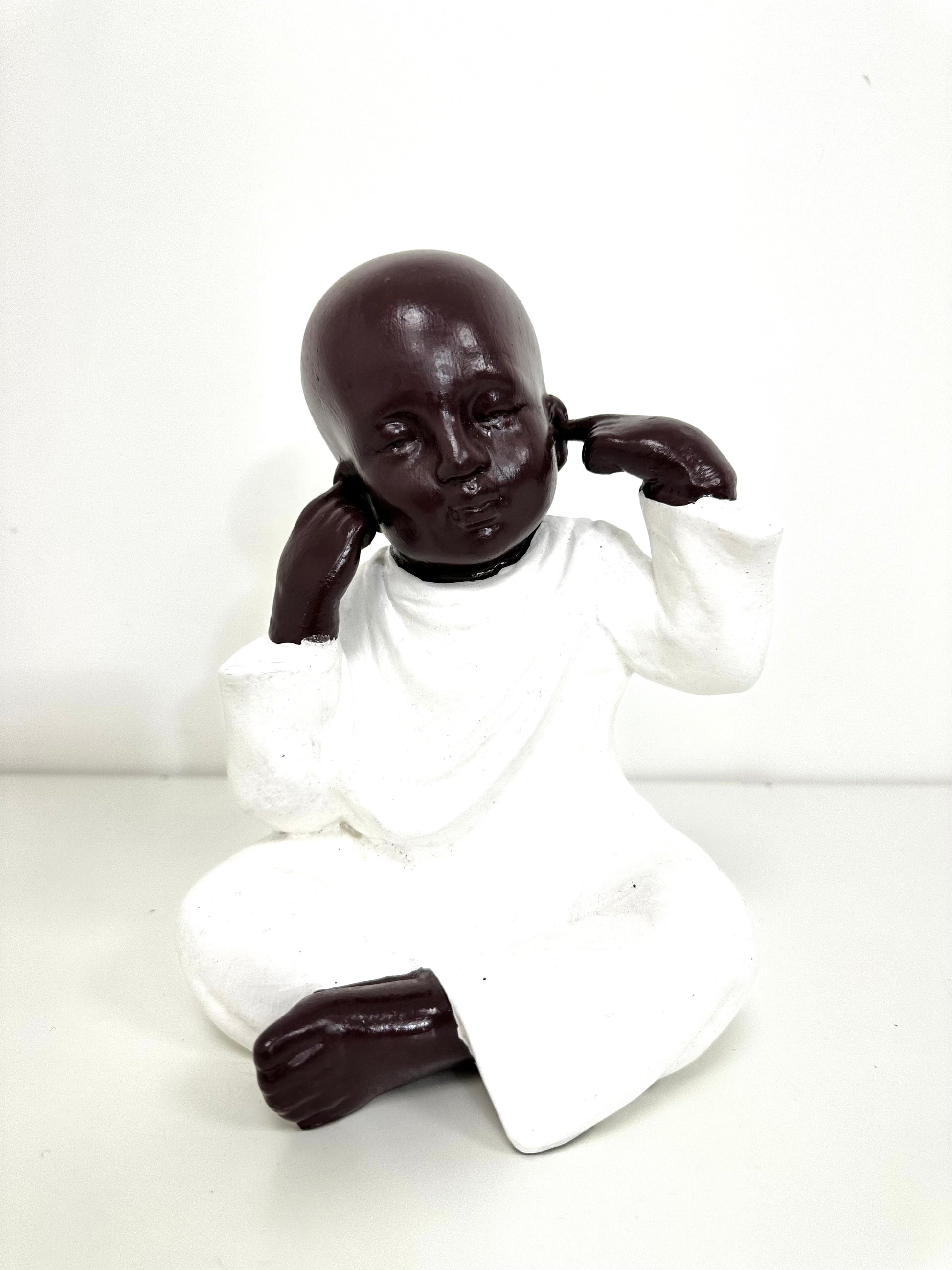Statue décorative représentant un jeune moine assis, les mains jointes devant la bouche. Cette posture illustre le principe de ne pas dire le mal, symbole de retenue et de bienveillance.