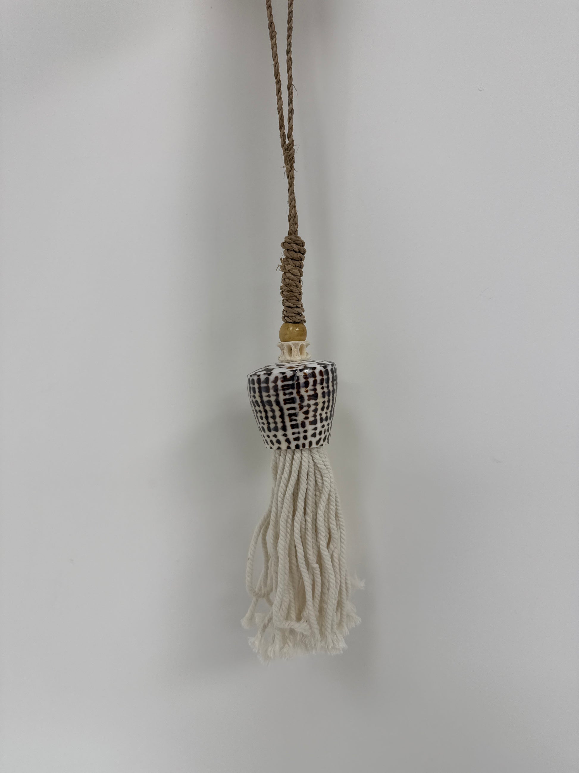 Cette suspension décorative est réalisée à la main à Bali à partir de matériaux naturels. Elle associe un coquillage central poli aux motifs naturellement contrastés, une perle en bois et une corde tressée, prolongée par une finition en corde écrue.