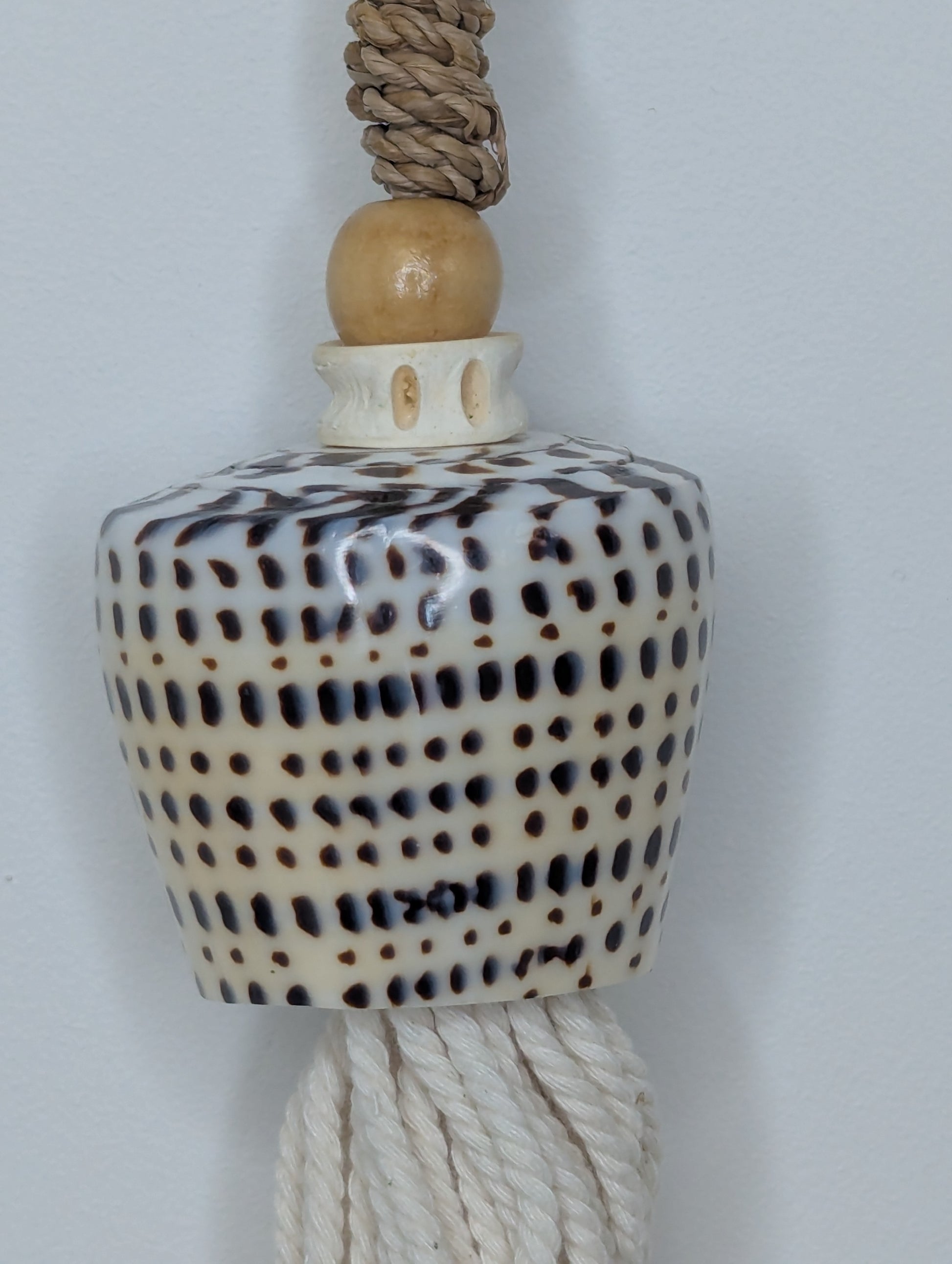 Son format fin et vertical en fait un élément décoratif facile à intégrer, aussi bien sur un mur, une poignée de porte, une patère ou dans une composition murale bohème. Le mélange des textures – coquillage, bois et fibre naturelle – apporte une touche ethnique chic et bord de mer, tout en restant douce et intemporelle.